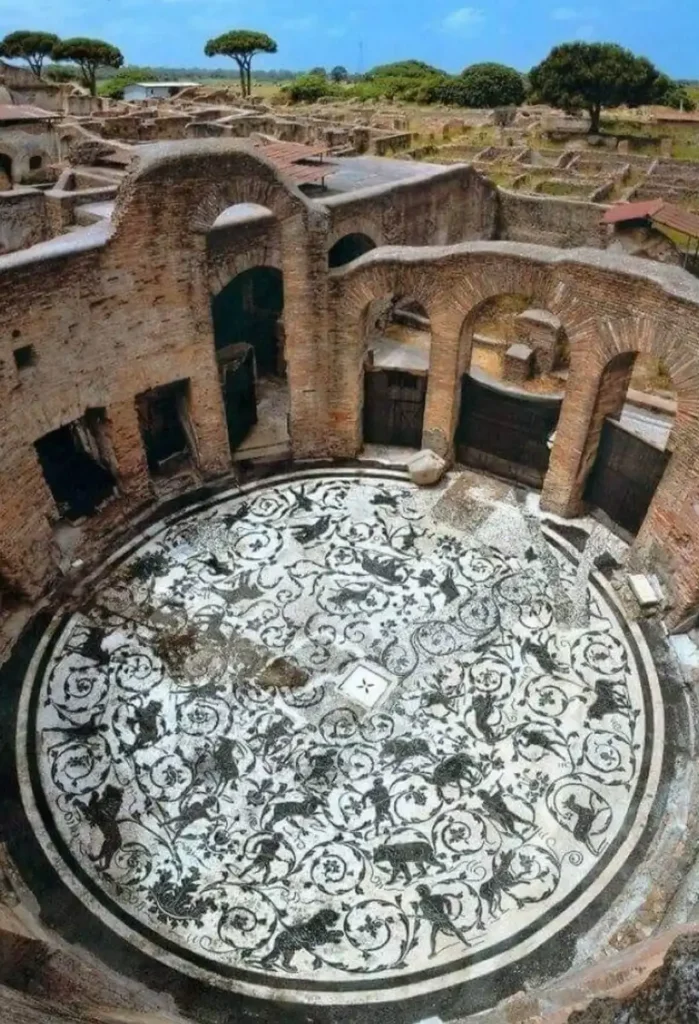 This floor mosaic, showing a hunting scene, once decorated the Baths of the Seven Sages at Ostia Antica and dates back around 1,800 years. Even centuries later, its energy still comes through.