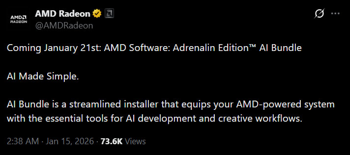 On January 21, AMD will officially launch its new AI Bundle for Radeon GPUs — a package the company describes as a “one-click” solution for running AI workloads locally. Rather than asking users to hunt down frameworks, drivers, and dependencies, AMD wants to deliver everything in a single, streamlined installer built directly into AMD Software: Adrenalin Edition.