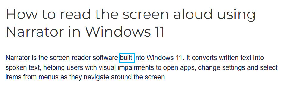 Now you will see the Narrator tool read aloud all the content displayed on the screen. The content that is read will have a green box as shown below.