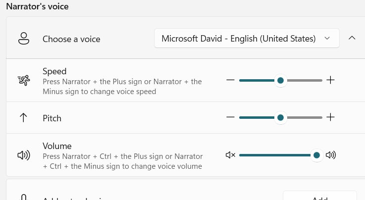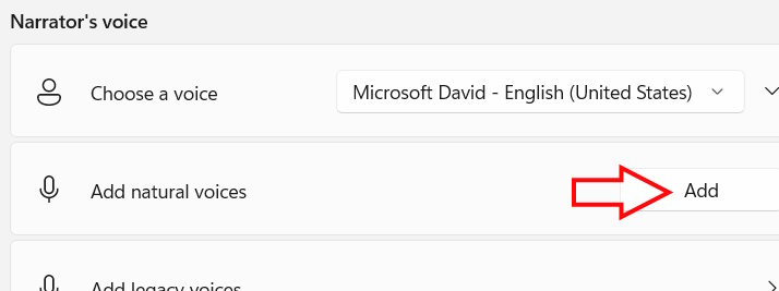 Scroll down to Narrator’s voice and select the voice you want for the tool. You can also click Add to install one of the new natural voice packs.