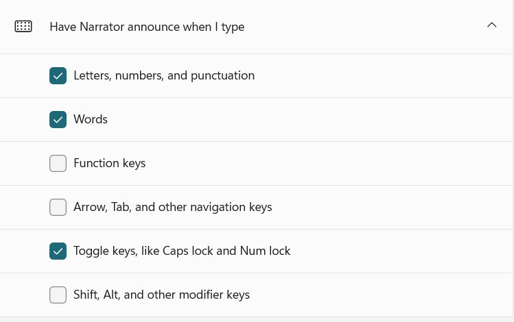 Continuing in the Have Narrator announce when I type section, you choose the level of detail at which Narrator will read the text as you type.