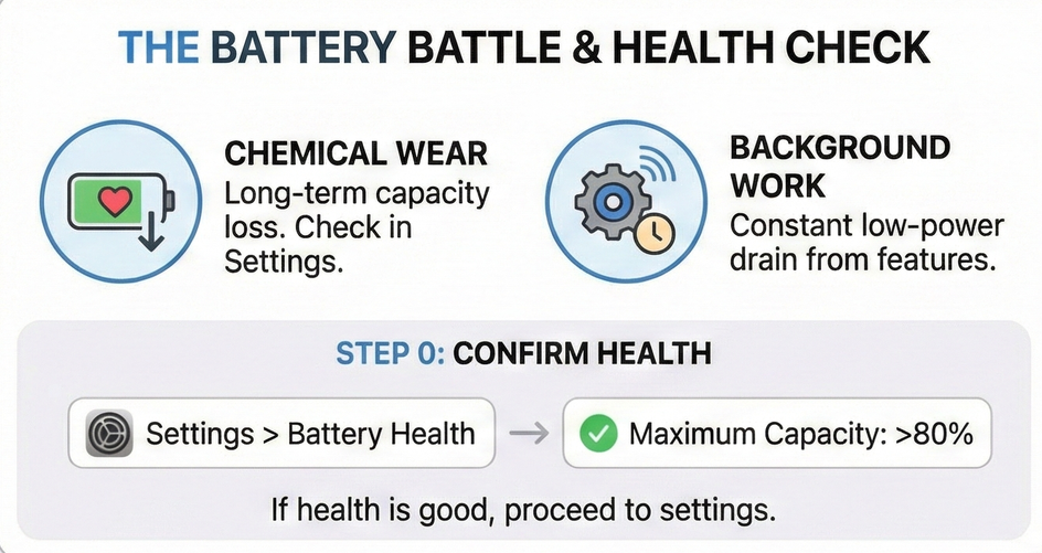 Battery degradation is only half the story. The real enemy is background work — small, cosmetic iOS features that quietly run all day, wake the system, hit the network, or activate hardware components you never consciously asked for.